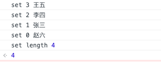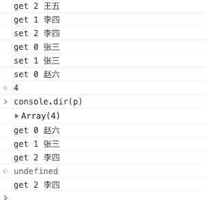 解析:数组将内部对象,依次往后移动一位,最后在开始位置插入赵六数据,所以需要重复的get,set特别,是最后一个值王五,移动到 3 号位置的时候,3 号位置没有被Object.defineProperty改写,因此打印出来的数据上 3 号位置没有get、set方法,也就没有触发set,console.dir(p)后也就没有触发get打印get 3 王五