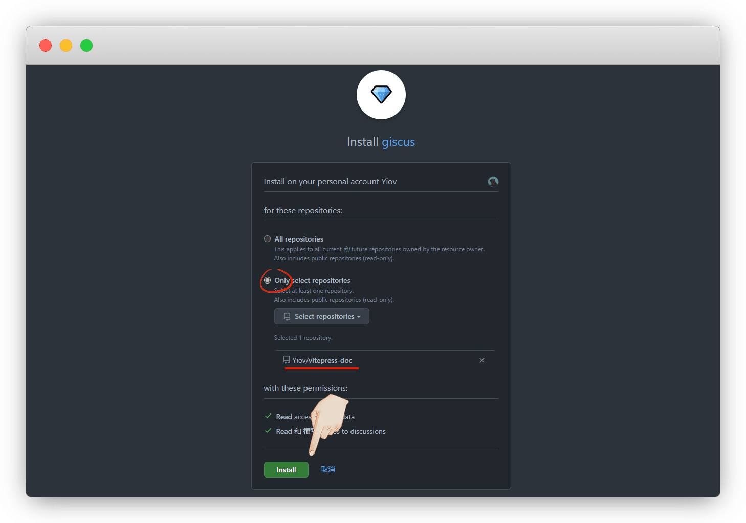 选择 Only select repositories,再指定一个你想开启讨论的仓库