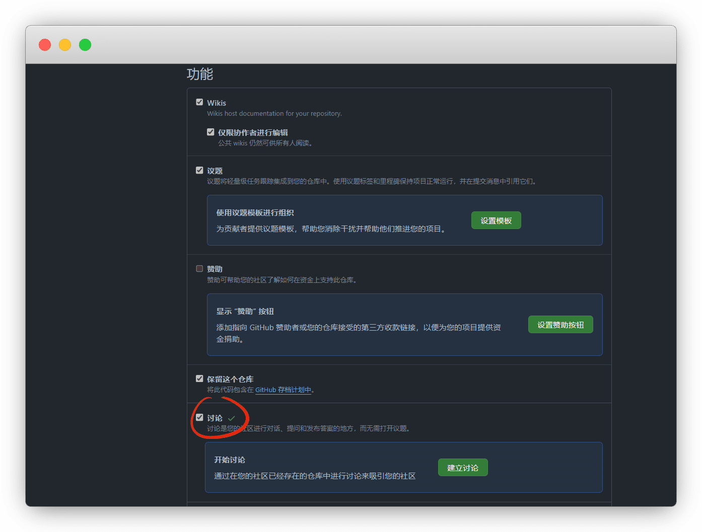 我们进入要开启讨论的仓库,点设置 - 勾选讨论 Settings - discussions