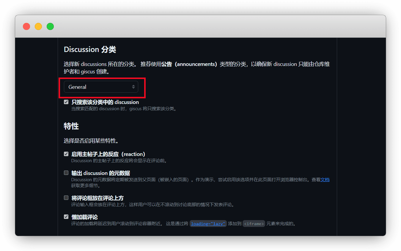 下拉到 Discussion 分类推荐选 General ,懒加载评论也可以勾选下