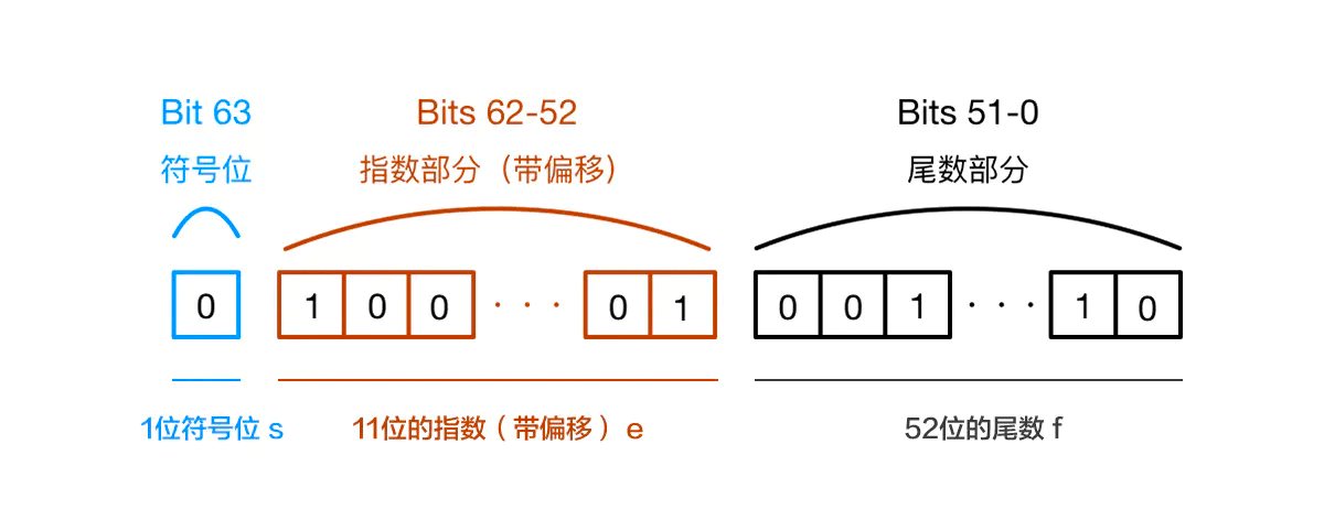- 64位浮点数, 1 位符号位 + 11 位指数(带偏移量) + 52 位的尾数